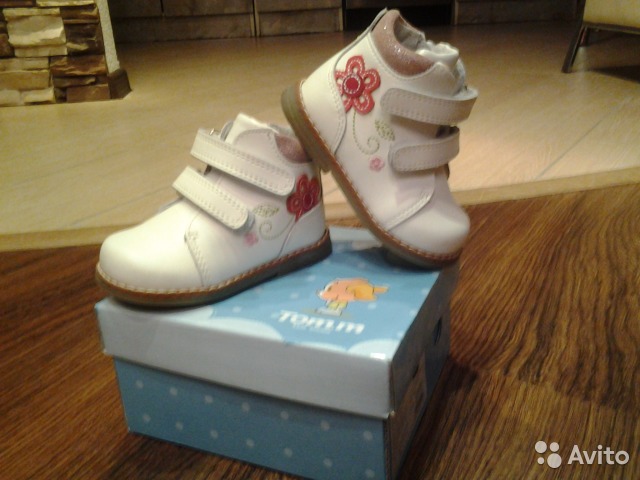 Фирма Tom.M, размер 19, натуральная кожа, липучки, замочки,ортопедические,подошва не скользит, белые с красными цветочками, упакованы в коробочку.