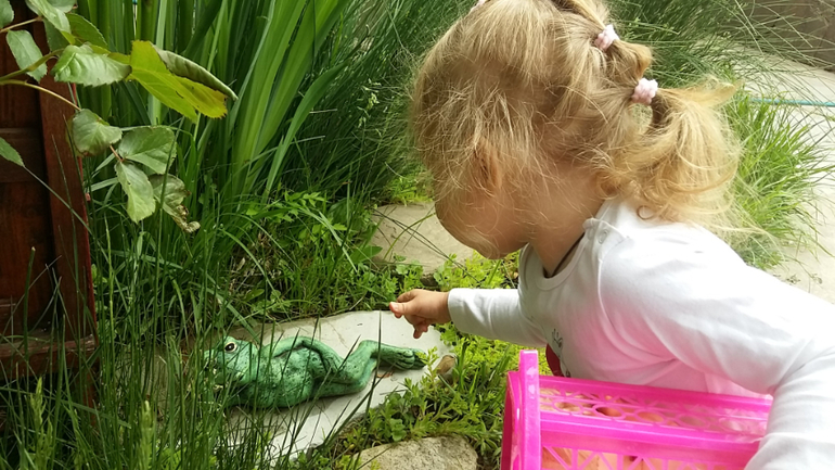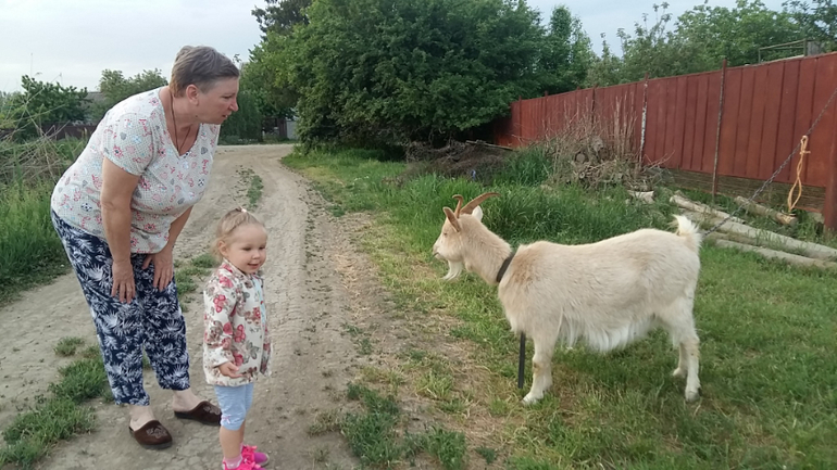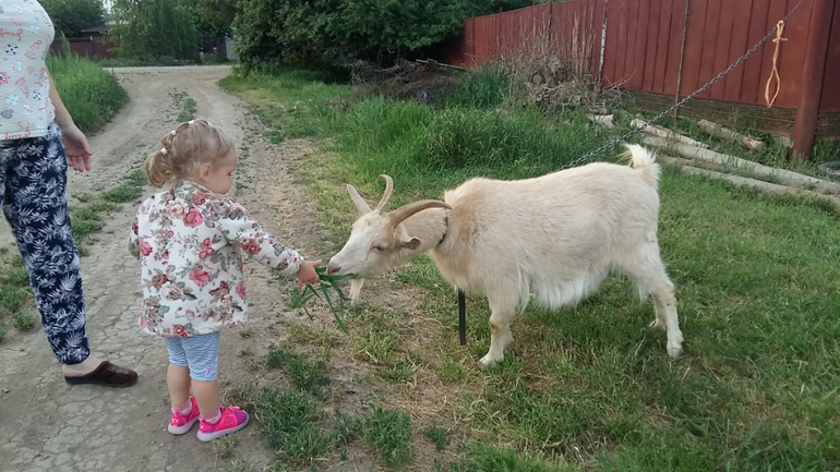 бабуля провела экскурсию по окрестностям , познакомила кнопу с козочкой))