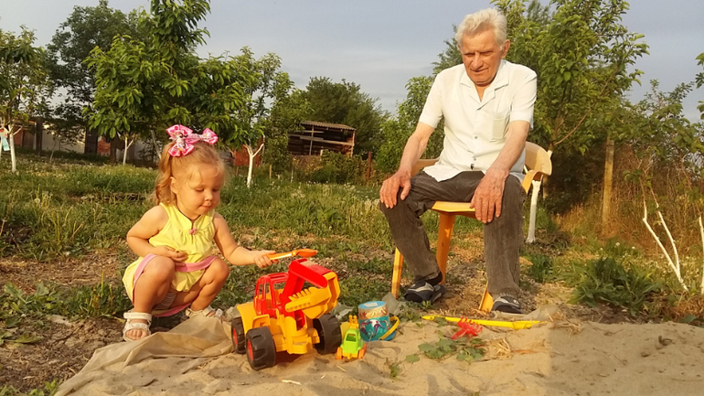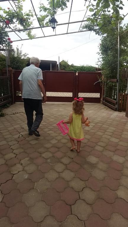 с прадедушкои все было сложнее! Арина не видела и не знает стареньких людей вообще , а дедушка еще и громко говорит и она плакала ка только он появлялся на горизонте!!! Даже спать сама первыи раз попросилась! Кстати ,наш приезд был для него сюрпризом)) Дедушка был рад увидеть правнучку , а мы рады что они знают друг друга!!!! напосмледок они почти подружились)) даже один раз в щечку чмокнула кнопа прадеда))