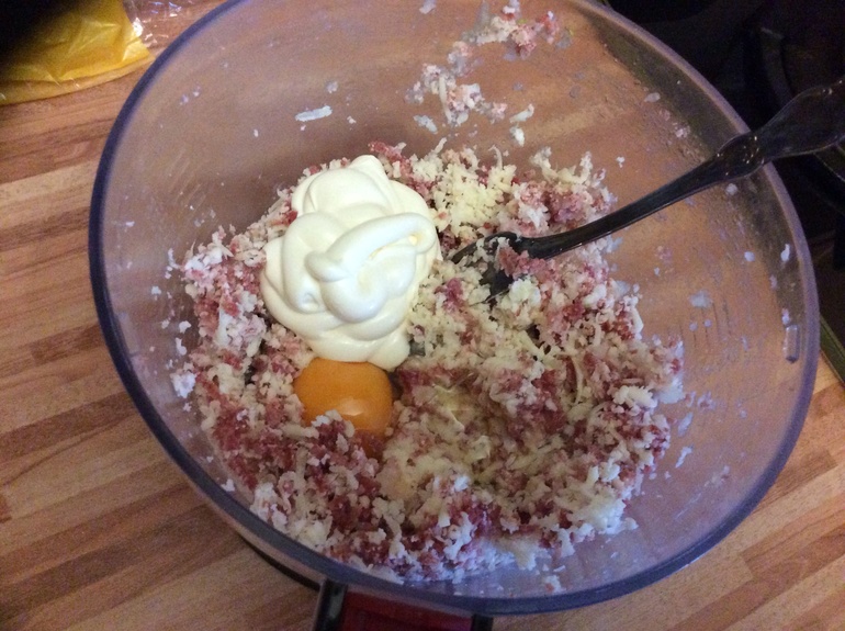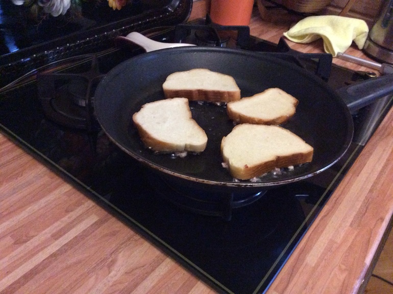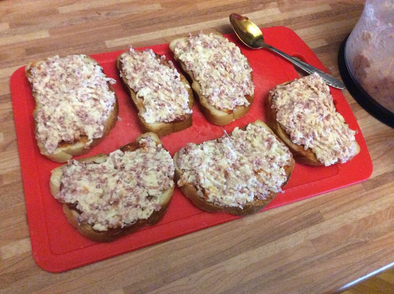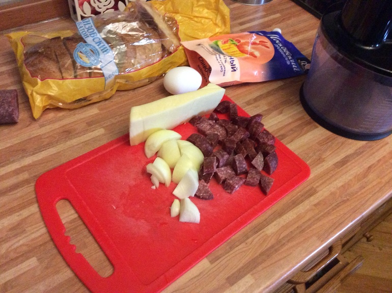 Колбаса, сыр, луковица трем на терку( можно и мелко порезать) сыр - терка.Все перемешать, добавить одно яйцо, майонез 1-2 ст ложки. На кусочки батона намазать кетчуп, затем массу и жарить на медленном огне массой вниз. Очень вкусно и экономно)