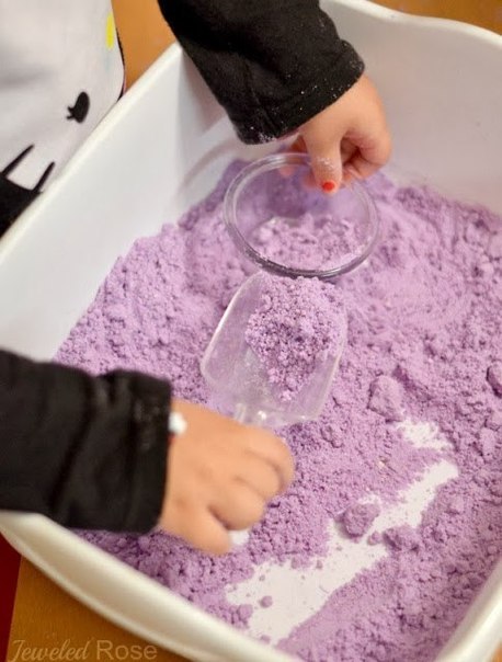 Смешиваете все ингредиенты до однородной массы в какой-нибудь емкости и даете малышу поиграть. Кстати, масло лаванды, отлично успокаивает, поэтому, если вы дадите поиграть в этот лунный песок перед сном, то малыш легче уснет.