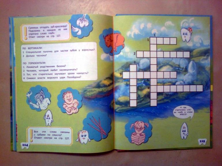 2) В книге довольно много творческих и логических заданий на разные возрасты. Можно сделать зубастую мордочку с малышом из прищепки и картона, а можно отгадать кроссворд на зубную тему (зубоскал, зубрила и пр.)