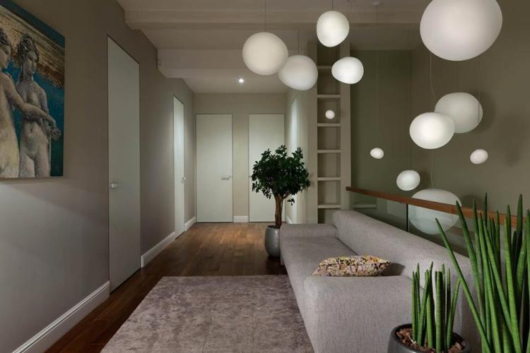 Данный интерьер спроектирован из двух небольших квартир, расположенных одна над другой. На первом "этаже" сейчас мы можем найти прихожую, кабинет, санузел для гостей, кухню и просторную гостиную. Поднявшись на второй этаж, мы найдем там спальню, гардеробную и ванную комнаты, а так же детскую игровую зону.