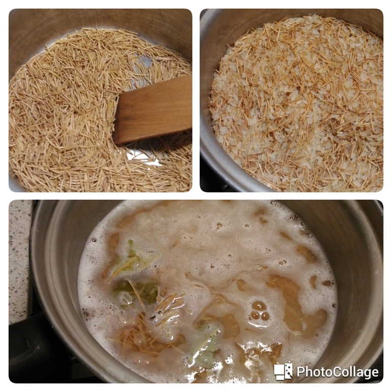 В кастрюльке с толстым дном поджарить без масла вермишель, которая для супа, до изменения цвета.