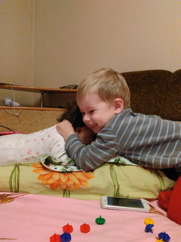 Недавно играется со мной рядом Егор. Взял шнурок, мостит его себе на носик сверху и пытается закрепить за ушки.
