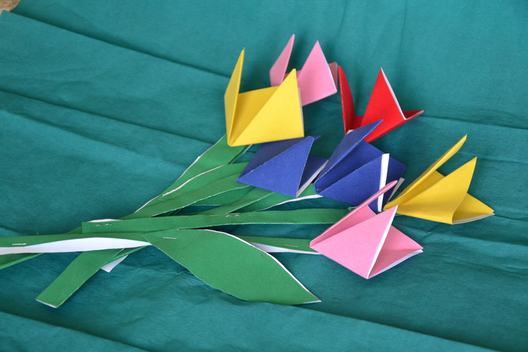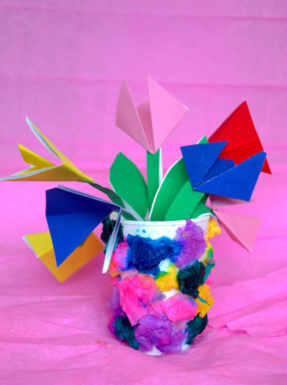 Поделки-оригами из бархатной бумаги - тюльпаны и вазочка (пластиковый стаканчик, обклеенный цветами из гофрированной бумаги)