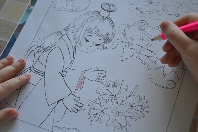 После прочтения сказки девочки мы откопировали некоторые листы с заданиями и разукрасили картинку с главной героиней сказки, сделали аппликацию и бумажных куколок.