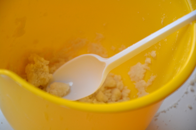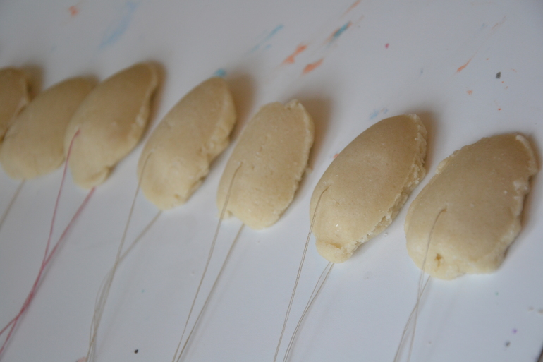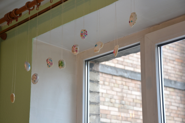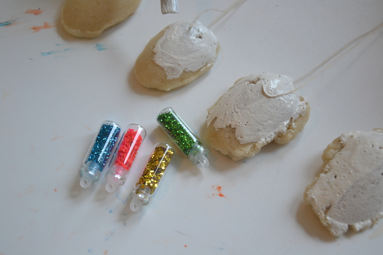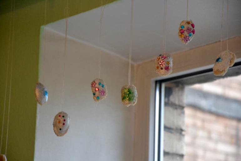 Из солёного теста (1 часть соли и 1 часть муки, немного растительного масла и воды) сделали декоративных яичек с помощью ложки, раскрасили их гуашью и украсили блестками, стразиками.
