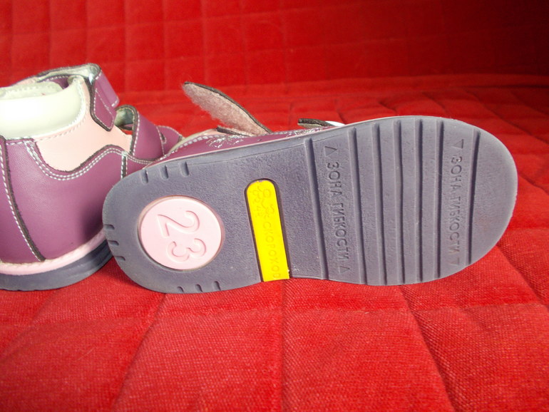 Натуральная кожа, даже клей на натуральной основе (без химии). Высокий твердый задник. Крепление: на велкро и пряжках (подходит на любой подъем). Супинатор. Эту модель можно использовать с ортопедическими стельками.