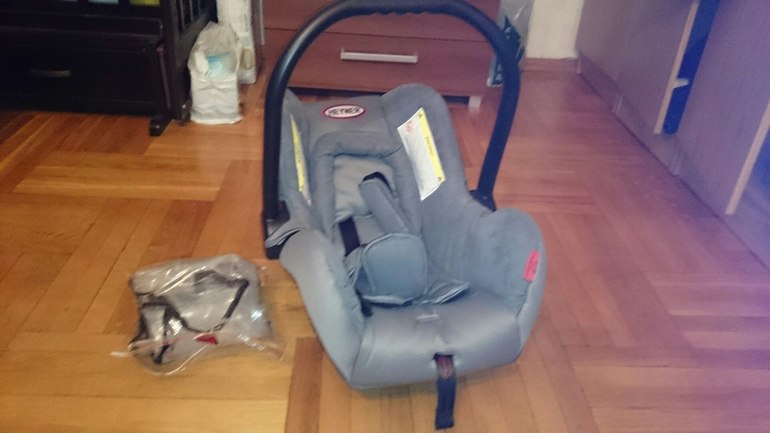 Кресло абсолютно новое, ребенка перевозили в нем буквально 2 раза. В комплект к креслу идет дождевик и козырек. Цена - 2500 руб.