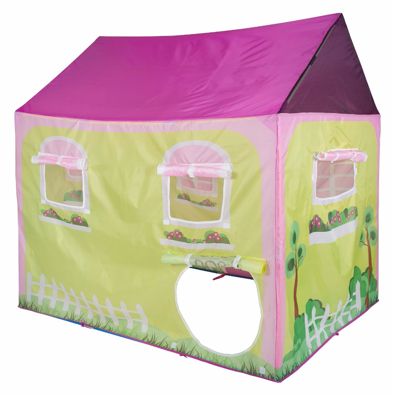 Подойдет для дома, дачи или игр на природе. Пластиковый каркас под силу собрать-разобрать пятилетнему ребенку. Двери и окна на застежках, прозрачная сетка на торцах крыши для вентиляции. Размеры позволяют вместить несколько детей и даже взрослых.