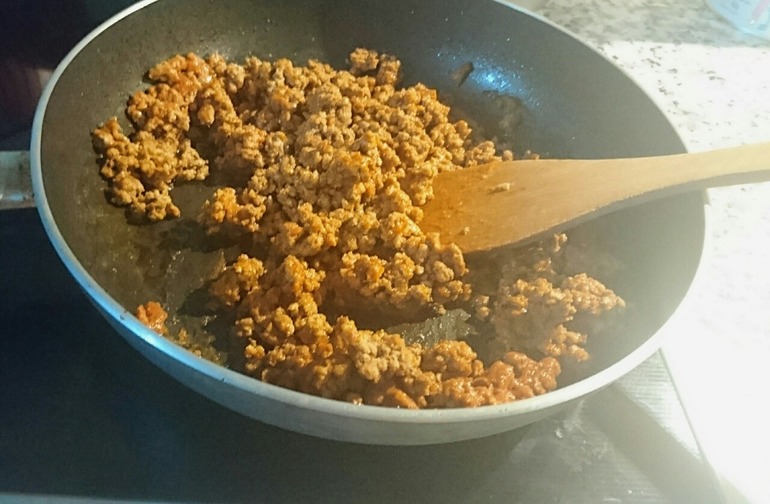 Пока баклажаны пекутся, сделала соус: потушила фарш с томатной пастой. Хорошо бы еще луковицу, но у меня не было.