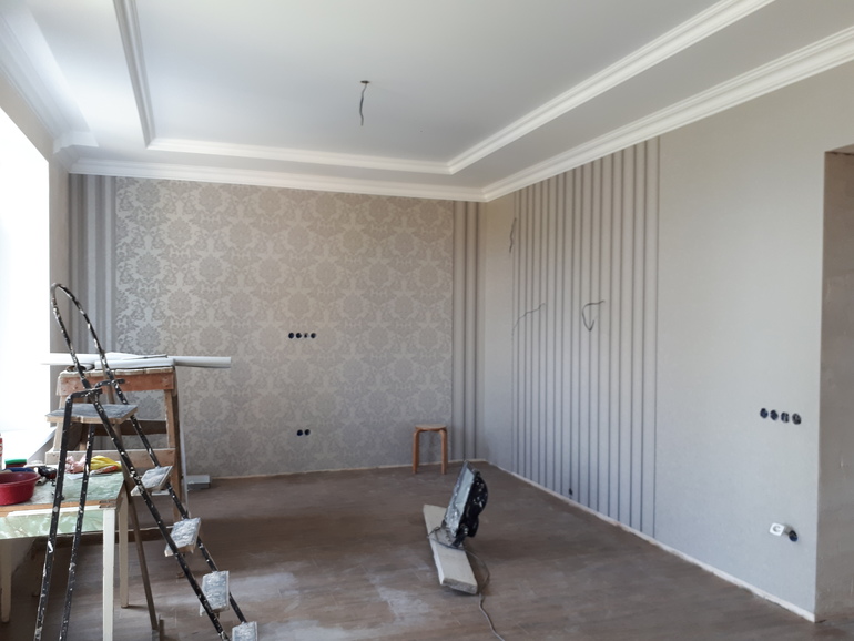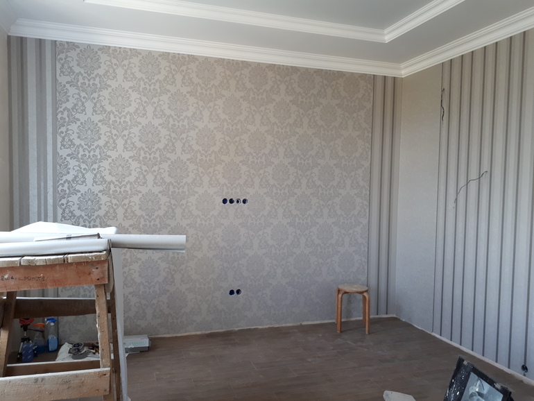 А мне нравятся сочетание полосок таких строгих и мужских с вензелями, такими женскими. Цветовая гамма хорошая, классическая схема такая, приятная. Поставите мебель, освещение какое, картины и декор, и не будет глаз мозолить