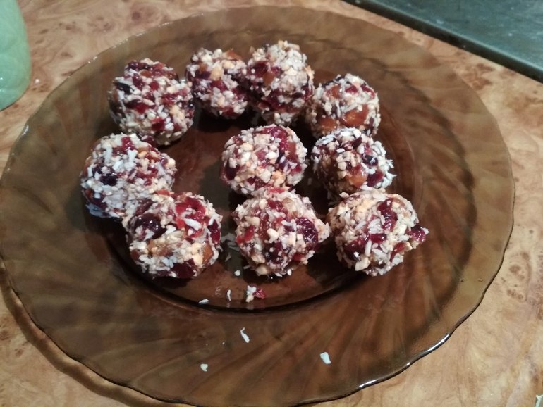 Я покупаю сухофрукты и орехи и делаю конфетки. Тут вариантов тьма, на сколько фантазии хватит. Но мое любимое сочетание это сушеная клюква, финики, кешью, Кокосовая стружка, можно сюда сироп или мед добавить. Катаю шарики и в холодильник.