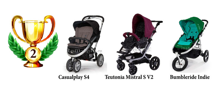 Bumbleride Indie 9 баллов - проходимый внедорожник, надежная, качество сборки отличное, при покупке теплого конверта к ней цена остается привлекательной. Не могла набрать максимальное количество баллов из-за посадочного места - всего 31 см.