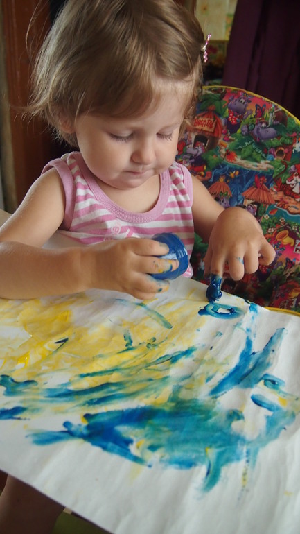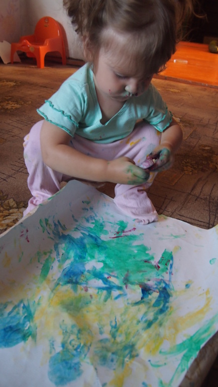 Последнее время увлекает её правда рисование, чем она только не рисовала! И пальчиковыми красками на старых обоях, и ручкой в тетрадке, и своими какашками на полу. Берёт листок бумаги, бежит за ручкой и калякает, калякает)) иногда просит меня, чтобы я рисовала на листочке, но почти сразу же забирает обратно. Но самое любимое это конечно же пальчиковые краски!