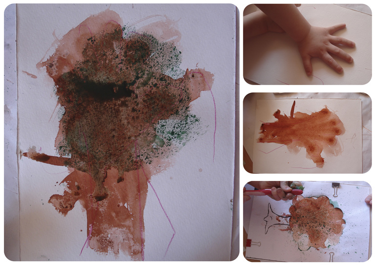В творческой части рисовали дерево отпечатком руки, а сверху щеткой набрызгали листики.