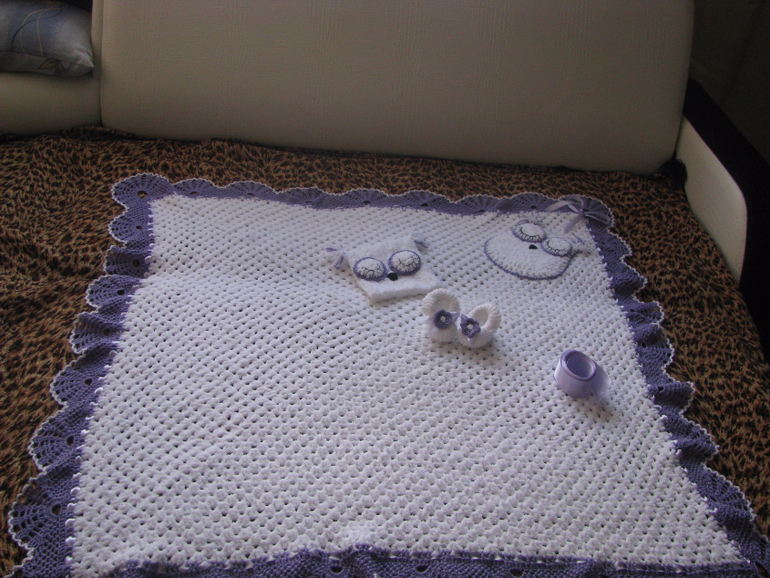 Пряжа Ализе Софти, расход отдельно на комбинезон не помню. Спицы - 4, платочная вязка. На резинках - Ализе Беби Вул. Пинетки - зефирки. Шапку пока еще не носили. К комбинезону прилагается еще плед, но он связан крючком, поэтому про него - в другой категории. На весь комплект расход - около 10 мотков.