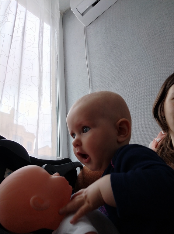 Итак, нашей Зое 7 месяцев, она пытается вставать на коленки, тренируется в ручках выпрямляться, разговаривать.