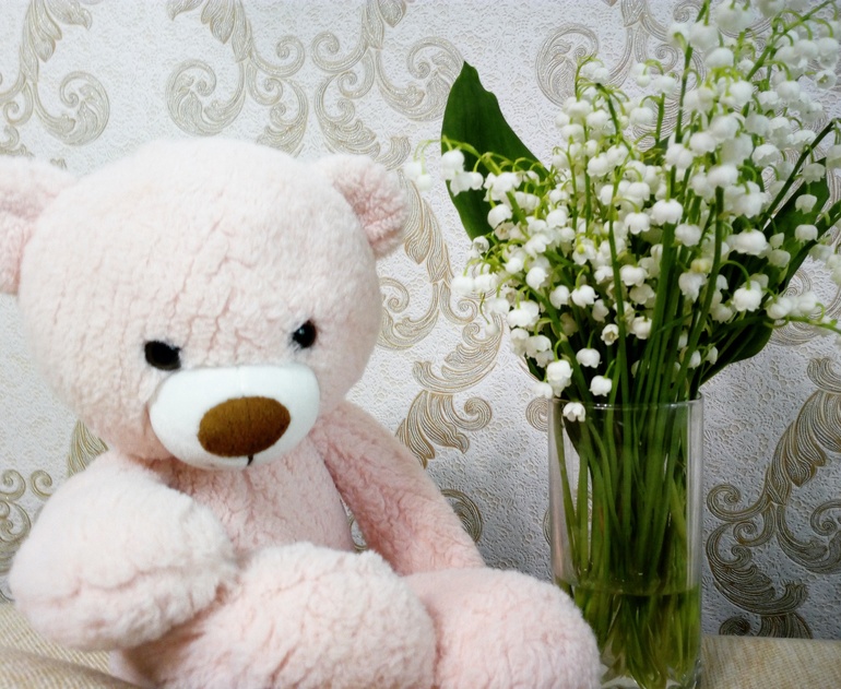 И спать с ним, и кушать с ним, и в мячик играть с ним. Так здорово идёт этим мишкой за мячиком, так хорошо у нее получается играть за медведя😄 а приходит с прогулки, даёт понюхать мише одуванчик.