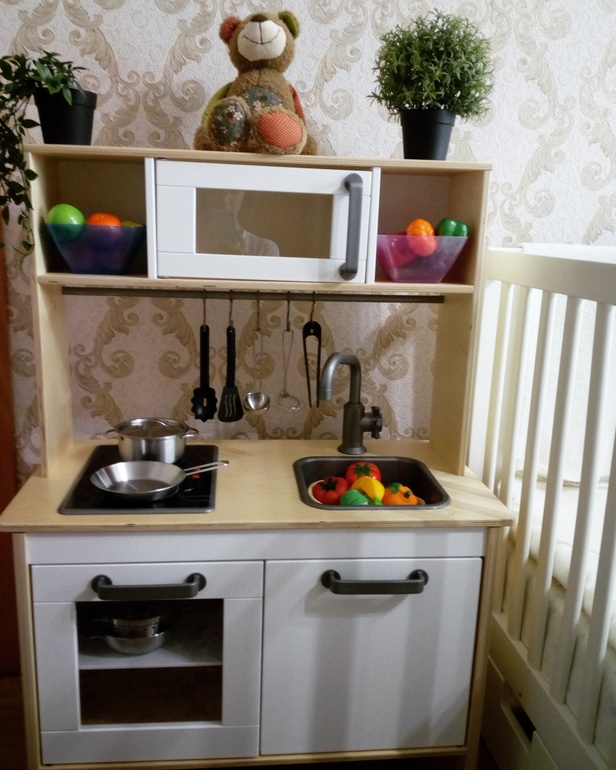 Правда чаще длинные предложения она просто повторяет, когда просишь, но иногда и сама говорит. Например, мама будет пылесосить)) Или, собака идёт гулять. Уже вполне сносно и понятно. Знает много стихотворений, может закончить строчку. Мы с ней на пару можем рассказать Муху-Цокотуху, Тараканище, Мойдодыра, и много маленьких стишков, Уронили мишку на пол, зайку бросила хозяйка. Память у Саши очень хорошая, мы с ней можем прочитать какое-то стихотворение впервые, а в следующий раз она может закончить уже некоторые строчки. С посторонними стала лучше контактировать, а то у нас было одно время, она прям букой у меня стала. А сейчас и привет, и пока скажет, и спасибо. И ответит, и сама иногда что-то расскажет. Со следующей недели начнем ходить на развивашки. У нас в городе есть центр, там занятия по Монтессори, зоны, подносы с материалом, Монтессори-педагоги. Занятия трехчасовые. У них политика такая, они говорят, что за стандартный час занятий ребенок только адаптирутся, привыкнет. Очень хочу, чтобы Саше все понравилось и она завела себе друзей в группе. Кухню Икеевскую Саше наконец-то раздобыла, ровно на неделю позже дня рождения подарили.