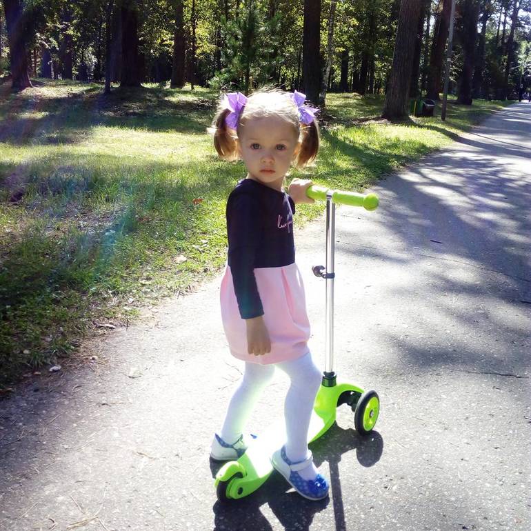 У нас пока нет таких спортивных достижений и речевых навыков. Самокат стоит без дела. Девочка просто супер развита!