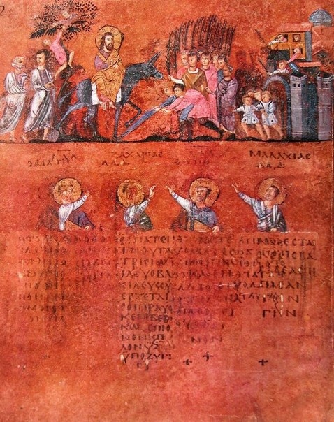 Ученики привели ослицу и молодого осла и положили на них одежды свои, и Спаситель сел поверх их. Множество же народа постилали свои одежды по дороге, а другие резали ветви с деревьев и постилали по дороге. Народ же, предшествовавший и сопровождавший, восклицал: «Осанна Сыну Давидову! Благословен Грядущий во имя Господне! Осанна в вышних!»