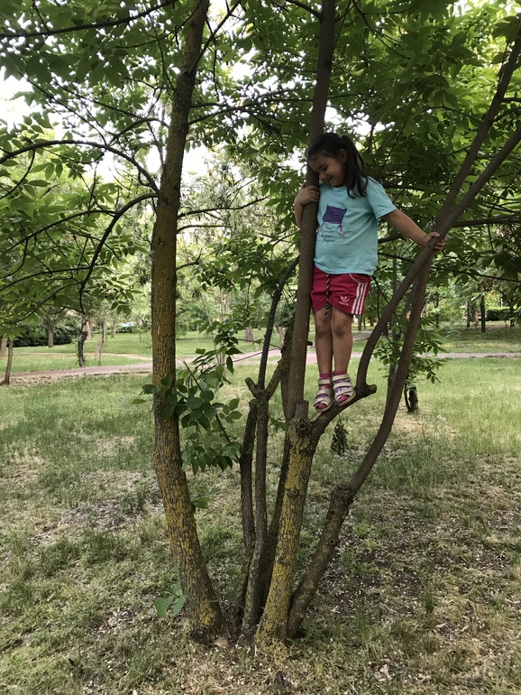 Соню научили играть в "мёд». Перестала бояться и научилась сама раскатываться высоко на качелях и спускать по горке-трубе. Лазить по деревьям.