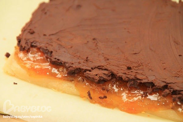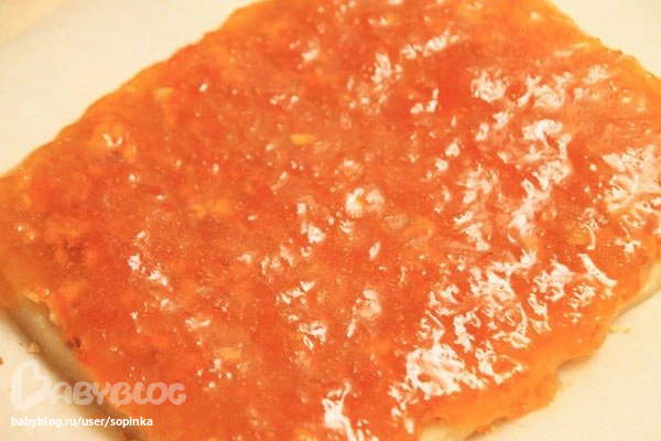 Мармелад можно выкладывать когда он достаточно схватится, но будет ещё текучий. Слой мармелада тоже полсантиметра толщиной.
