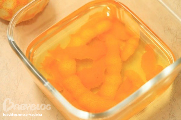 Срежьте цедру апельсина тоненьким слоем, так, чтобы не попала белая подложка. Залейте её холодной водой и оставьте на ночь. На следующий день воду слейте, цедру измельчите в мельнице, залейте стаканом воды и поставьте тихий огонь на 30мин.