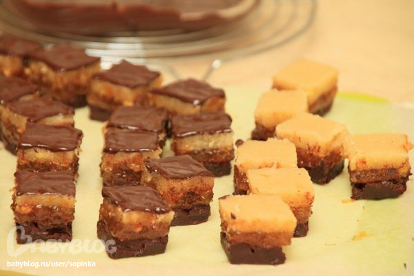 Сверху положите трюфель. Если он успел затвердеть следует слегка подтопить его на водяной бане и хорошенько перемешать. И трюфеля тоже полсантиметра. Трёхслойную конструкцию убираем в холодильник для полного затвердения и охлаждения. Минут на 10.