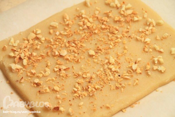 Отложенные орешки порубите и обжарьте на сковороде до светло-золотистого цвета. На пергаментной бумаге, слегка посыпанной сахарной пудрой, раскатайте марципан. Сформируйте его в виде прямоугольника толщиной полсантиметра. Равномерно посыпьте орешками.