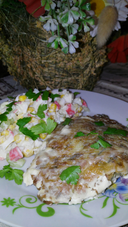 В раскаленном масле обжариваем мясо, спрятанное в "шубку". Жарим, осторожно переворачивая, до румяной корочки.Выкладываем отбивные на смазанный слегка маслом противень или форму.