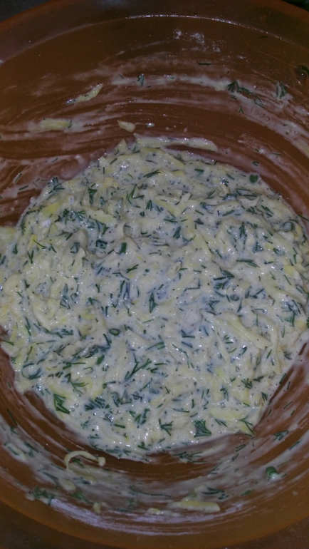 Приготовим "шубку" для наших отбивных: на крупной терке натираем сырой картофель, мелко режем лук, зелень, натертый или измельченный в чесночнице чесночок, все перемешиваем, солим, перчим, добавляем яйца, майонез или сметану (2 ст. л.) и муку. Все вымешиваем.