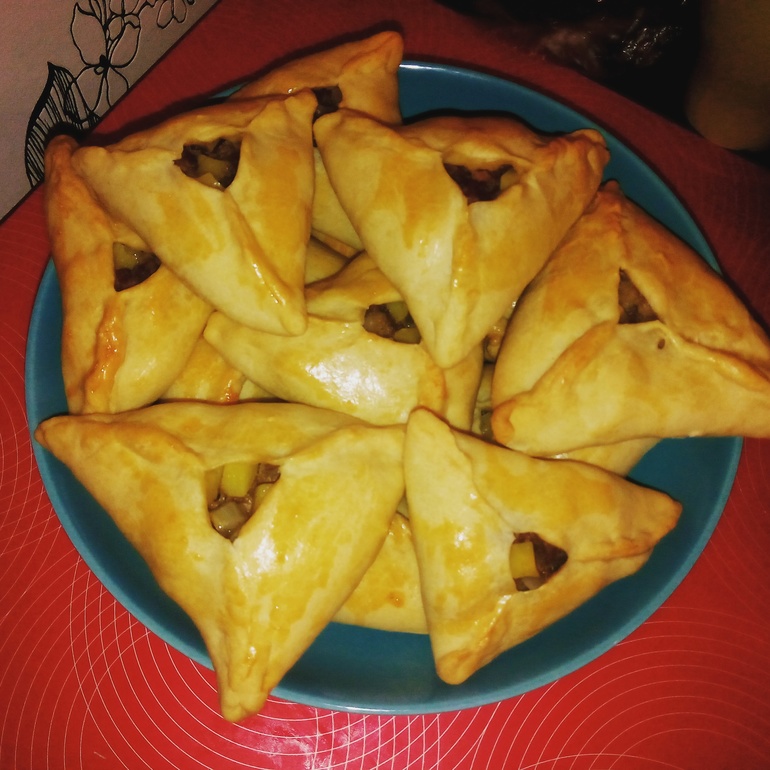 Начинка: мясо, лук, картошка, соль, перец и зира).