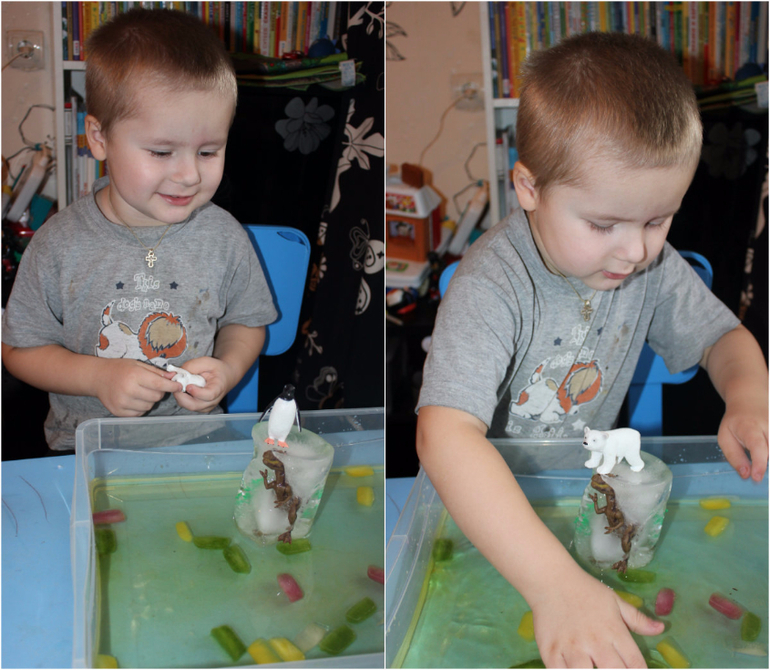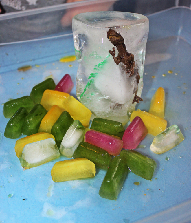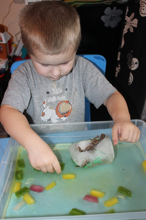 Пристал ко мне Темик.Давай говорит,бабуся динозавра заморозим,раскопки проведем и цветной лед сделаем.Ну разве ребенку откажешь в этом удовольствие)