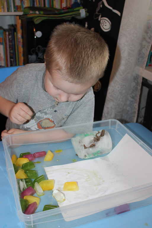 Хотели порисовать льдом,но мне лень было с зубочистками возиться,но лед все равно подкрасили)попытались рисовать,но красителей мало добавила,очень бледный след оставался((да и ручкам холодно держать лед.