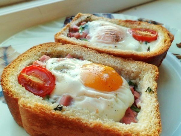 2. Вбиваем одно яйцо, соли и перчим. Сверху 1/2 кубиков сосиски, 1/2 лука и 1/2 укропа. На всю эту красоту вбиваем ещё одно яйцо. Солим его и перчим. В уголок кладём половинку черри. Краешки хлеба слегка прокапываем оливковым маслом. Теперь повторяем всё со вторым кусочком хлеба. И всю эту красоту в духовку на 15-20 минут.