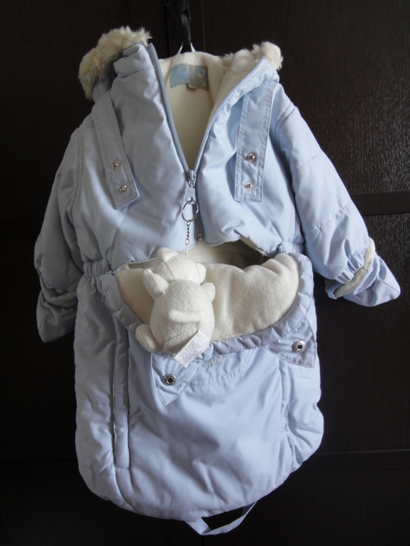 Конверт-трансформер превращается в комбинезон при необходимости. Отличное качество, состояние идеальное. Покупался заграницей. Идёт в комплекте с шапочкой и шарфиком.