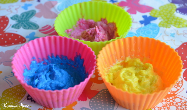 4. Перемешать до однородной массы, могут быть комочки (если много добавить воды - получится цветная пена).