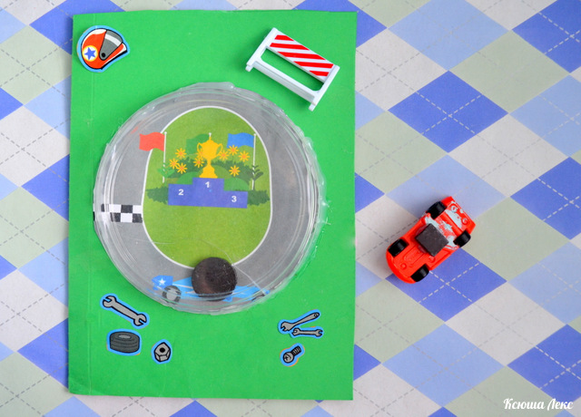 На маленькую машинку, приклеиваем горячим пистолетом второй магнит, теперь она будет держаться и "кататься" по поверхности крышечки.