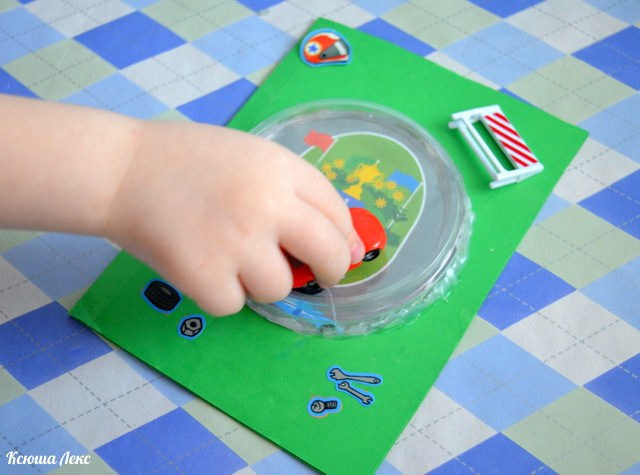 Как сделать: цветной картон, складываем пополам, приклеиваем по центру дорогу (я вырезала из детского пособия), кладем 1 магнит по центру, сверху приклеиваем пластиковую крышечку (чтобы магнит, остался внутри и мог передвигаться).