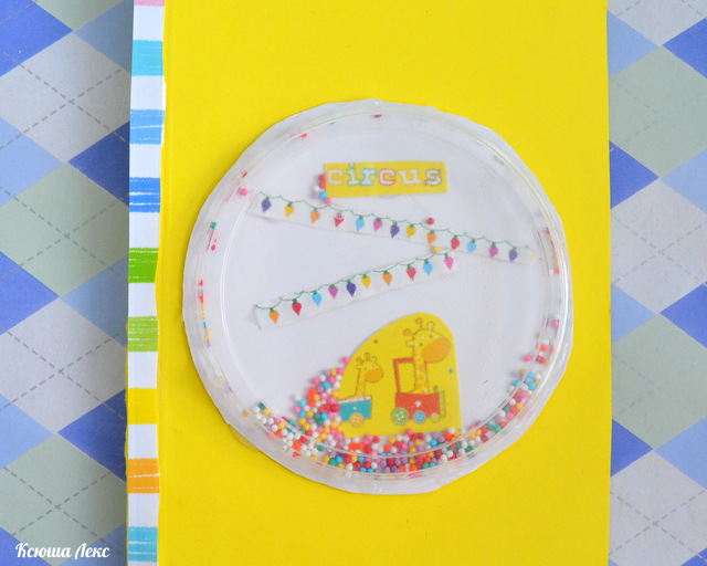 Вот такая яркая, получилась открытка-коллаж (ибо собрана из кусочка детского журнала, упаковки от детского товара и даже лампочки, мы вырезали из магазинного буклета).Тут наши разноцветные шарики, пришлись очень кстати! "Салют" в цирке!