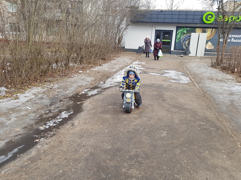 Первый раз вышесли на прогулку свой мотоцикл. В восторге остались мы оба. Я думала покатаемся возле дома, а нет. Объехали теириторию намного больше, чем на коляске. Глеб гоняет очень быстро. Летом будет гаш фаворит, я уверена. Ну и самокат будем осваивать, когда потеплеет. А ещё толокар такой лёгкий, что нет проблем его спустить, поднять, немного пронести.