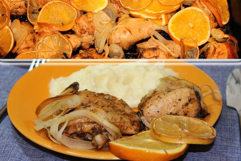Апельсины и один лимон ( второй мы использовали для того чтобы получить лимонный сок) нарезаем колечками, также поступаем и с луком. Кладем колечки апельсина, лимона и лука на курочку и отправляем все запекаться в разогретую до 200 градусов духовку на 1- 1,5 часа ( время зависит от размеров кусочков). Когда курочка подрумянится, а цитрусы слегка подсохнуть, блюдо можно доставать и подавать к столу. На гарнир можно приготовить отварной картофель, картофельное пюре или рис.