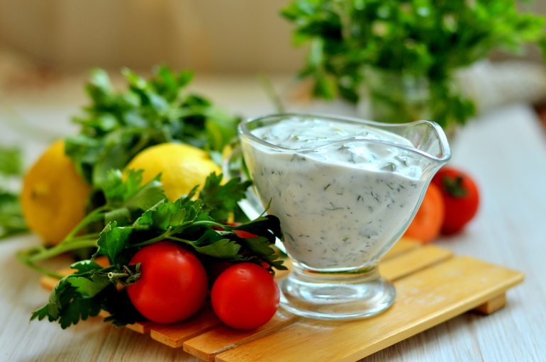 Смешиваем йогурт, зелень, лимонный сок, масло, чеснок и специи.
