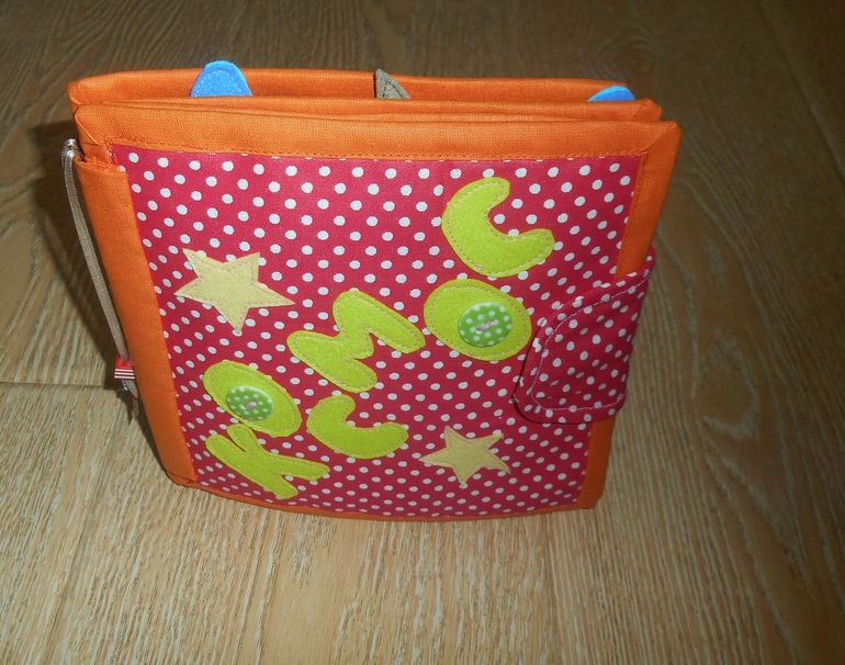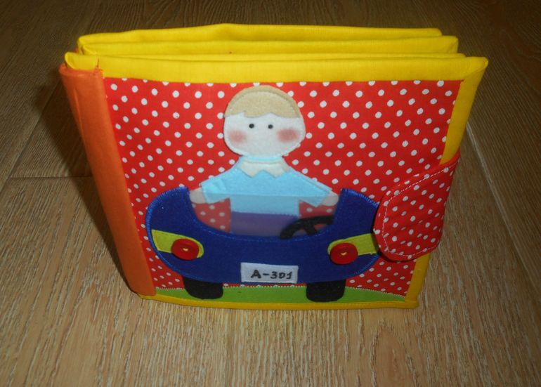 Состоит из 7 секторов - разного цвета ( изучаем цвет) - каждый сектор разная застежка: петля ( крупная) - пуговица, резинка - пуговица, кнопки, липучка -крупная петля, карман, карабины, бант (учимся завязывать и развязывать). За каждым "кармашком" - кто то спрятался))