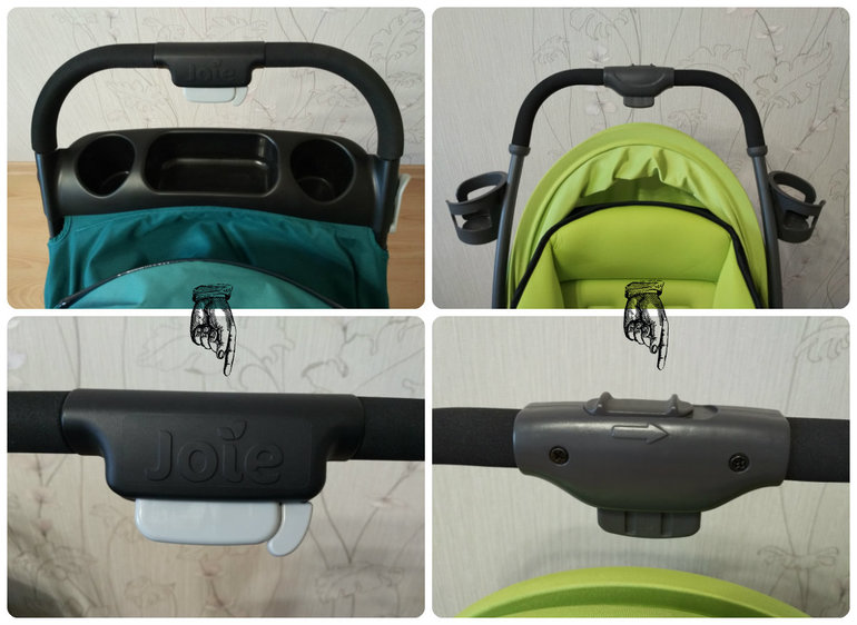 Ручка регулируется только у Joovy - она перекидная, что удобно, когда малыш еще маленький и постоянно хочет видеть маму. У Joie ручка не имеет такой функции.