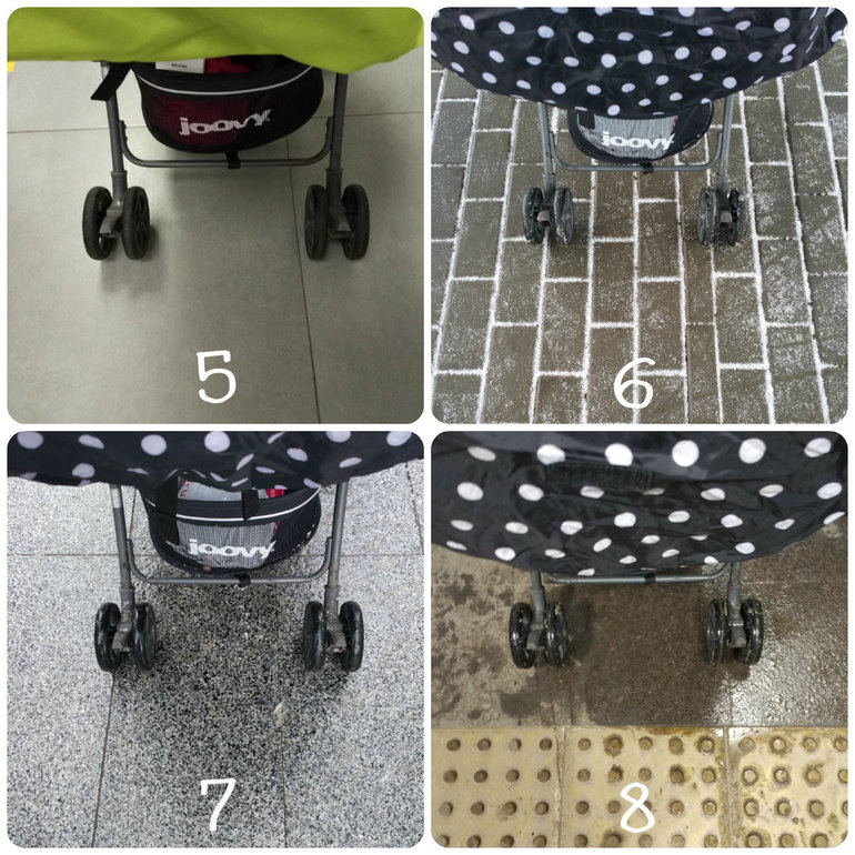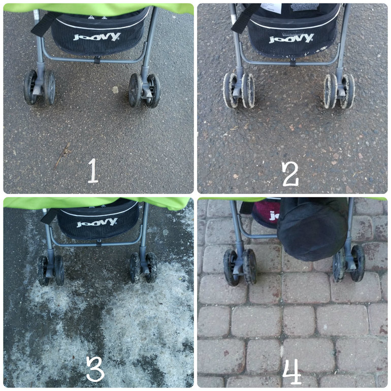 Этот пункт очень важен для тех, кто собирается возить совсем малышей в прогулочных колясках. Надо понимать, что полиуретановые колеса не дадут такого плавного хода по асфальту и плитке, как надувные. Надо сравнивать с подобным - как раз то, что я и делаю. Немного подглядев в инструкцию к обеим коляскам, я выяснила, что у Joovy амортизация присутствует на всех колесах, а у Joie - только на передних. Ну, и вообще стоит отметить, что по плитке обе коляски не дают идеального хода - здесь только надувные колеса спасут. Как мне показалось, Joovy Balloon дала более плавный ход, даже несмотря на свой маленький вес.