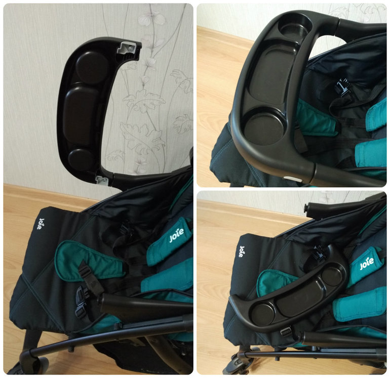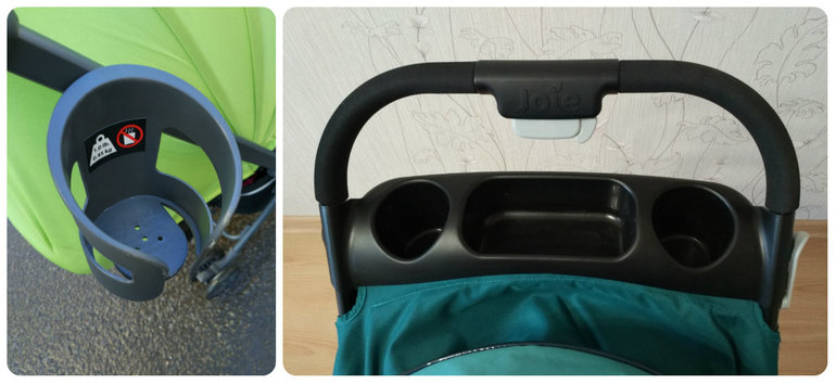 Сравнивая именно эти модели, у меня есть возможность выделить и этот пункт, ведь у Joie есть панель для мелочей и напитков, даже две: на ручке - для мамы и на бампере - для ребенка. У Joovy Balloon по бокам ручки крепятся 2 съемных подстаканника.